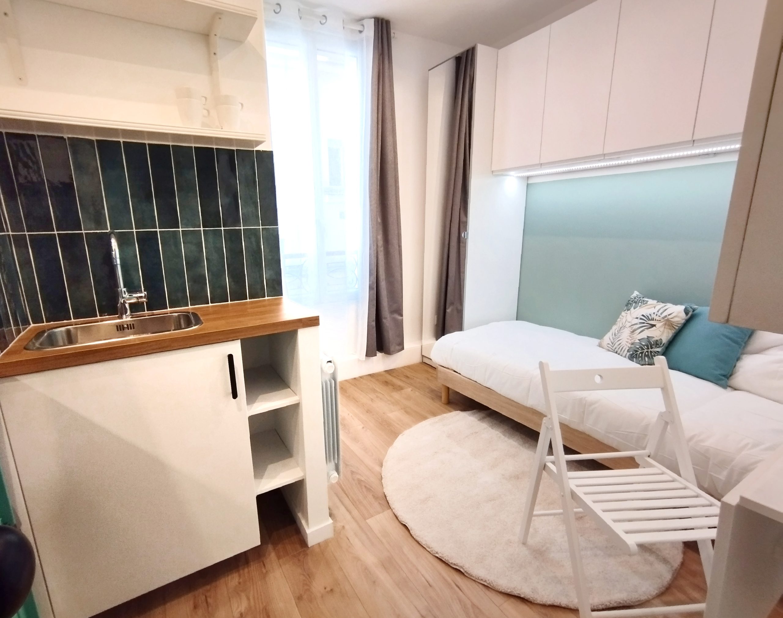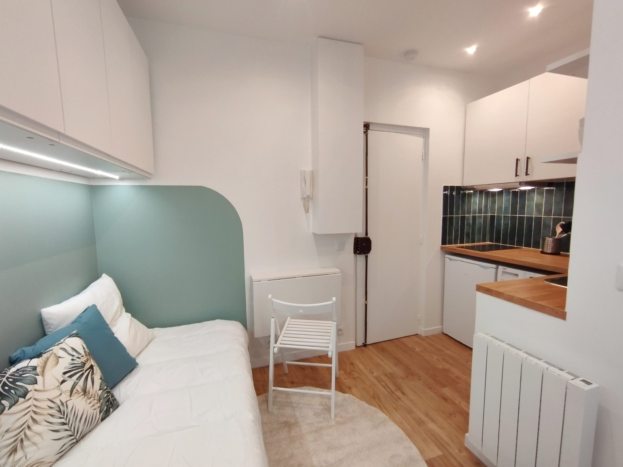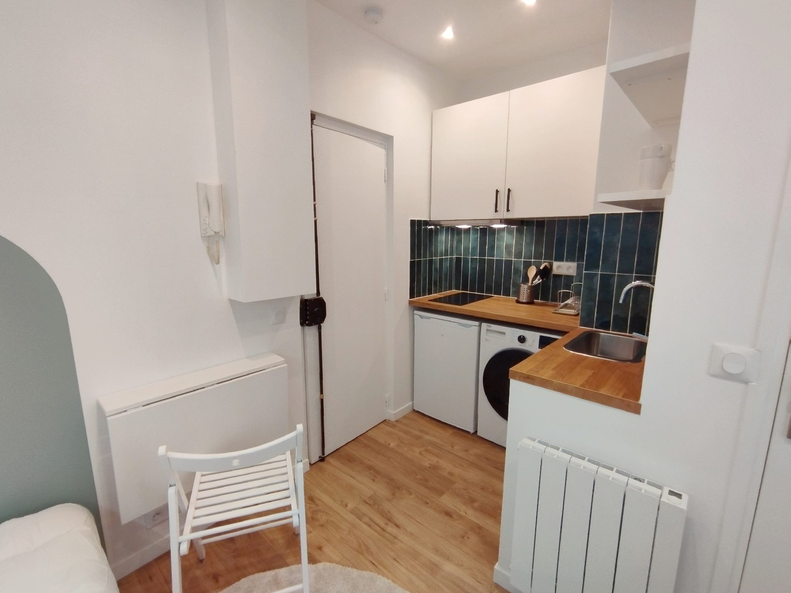 Rue Riquet/Ordener, métro ligne 2/4/12, studio meublé 1er étage sur cour et au calme, composé d'une pièce principale, coin cuisine équipée dont lave linge, salle d'eau (douche, lavabo et wc). Disponible de suite à la location.