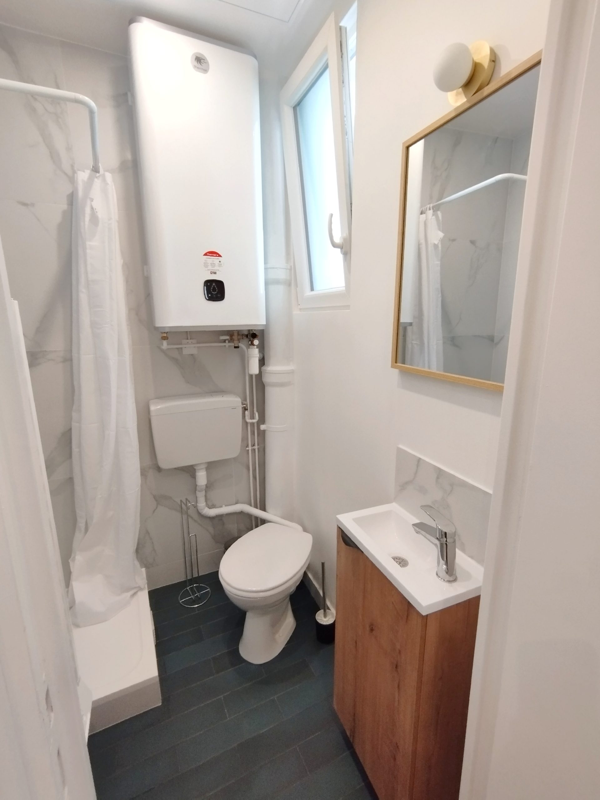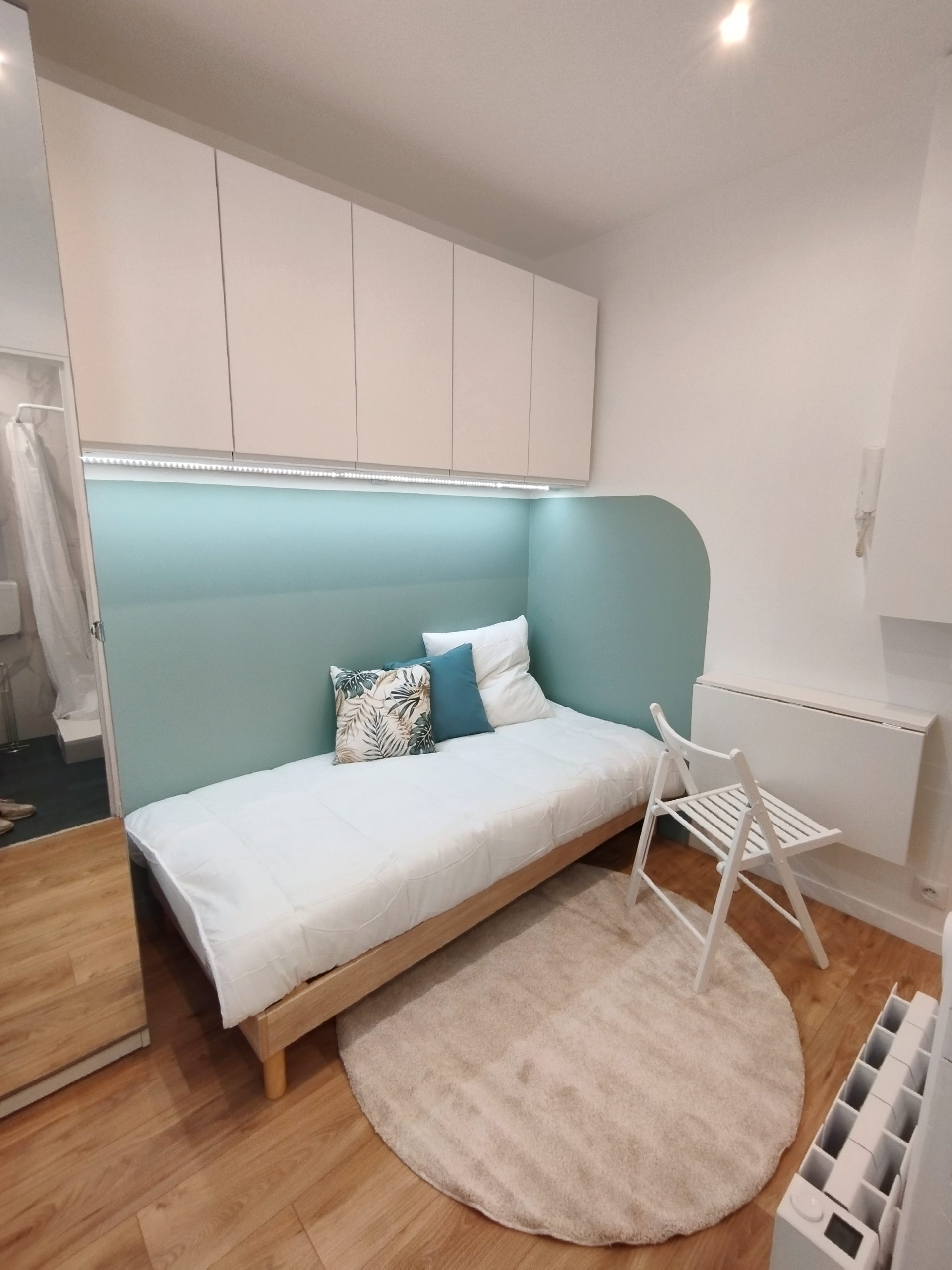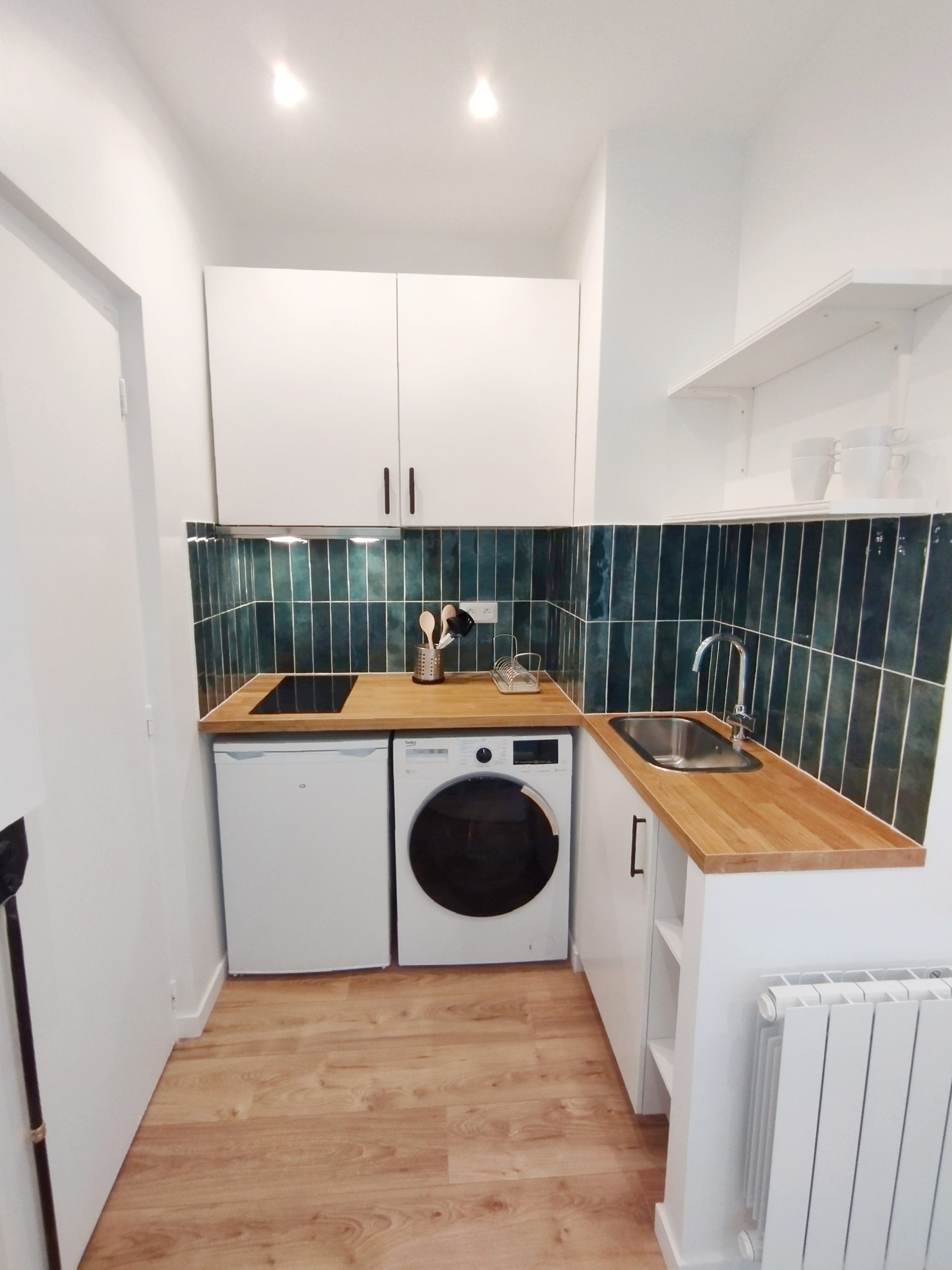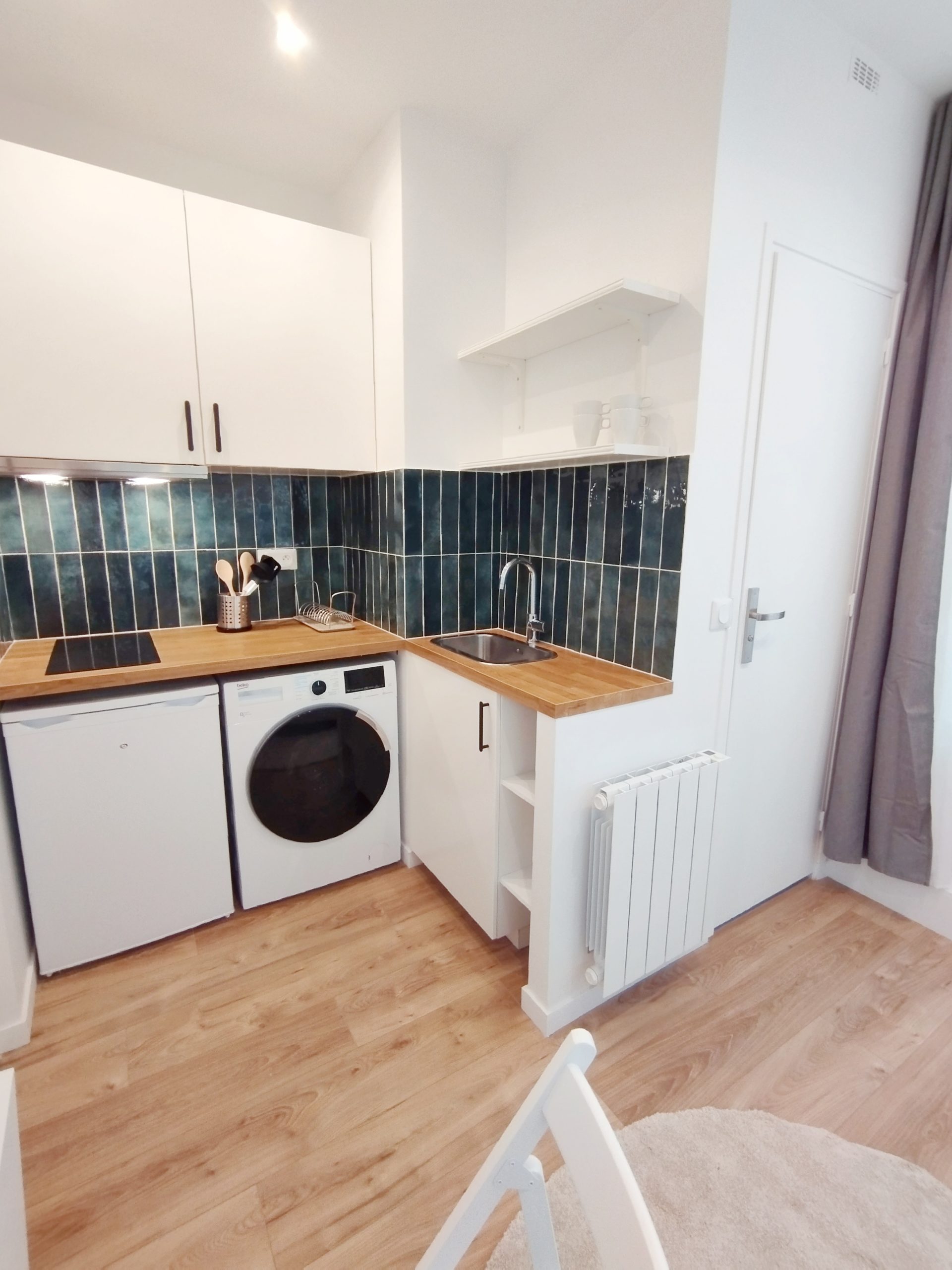 Rue Riquet/Ordener, métro ligne 2/4/12, studio meublé 1er étage sur cour et au calme, composé d'une pièce principale, coin cuisine équipée dont lave linge, salle d'eau (douche, lavabo et wc). Disponible de suite à la location.